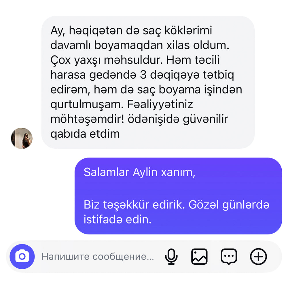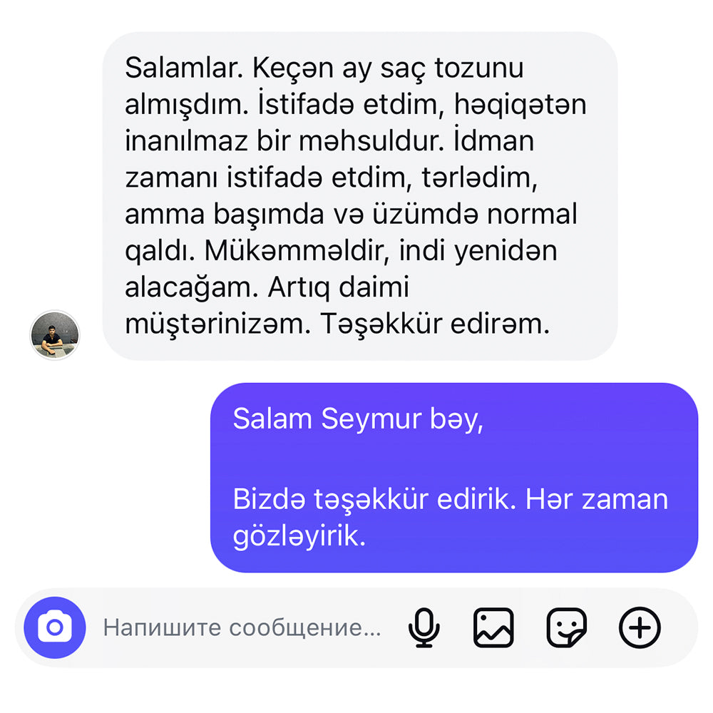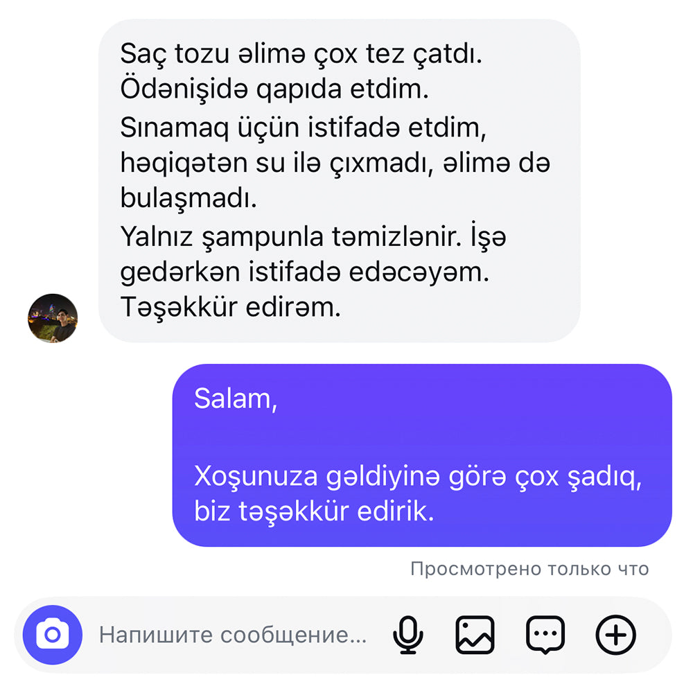 Saç tozunun sizə dəyər qatacağına tam əminik! Buna görə sizə 15 günlük Məmnunluq Zəmanəti təqdim edirik. Əgər məmnun qalmasanız, Geri Qaytarma və Pulun Geri Ödənilməsi Siyasətimizə əsasən pulunuzu tam şəkildə geri qaytarmaqdan məmnun olarıq.
