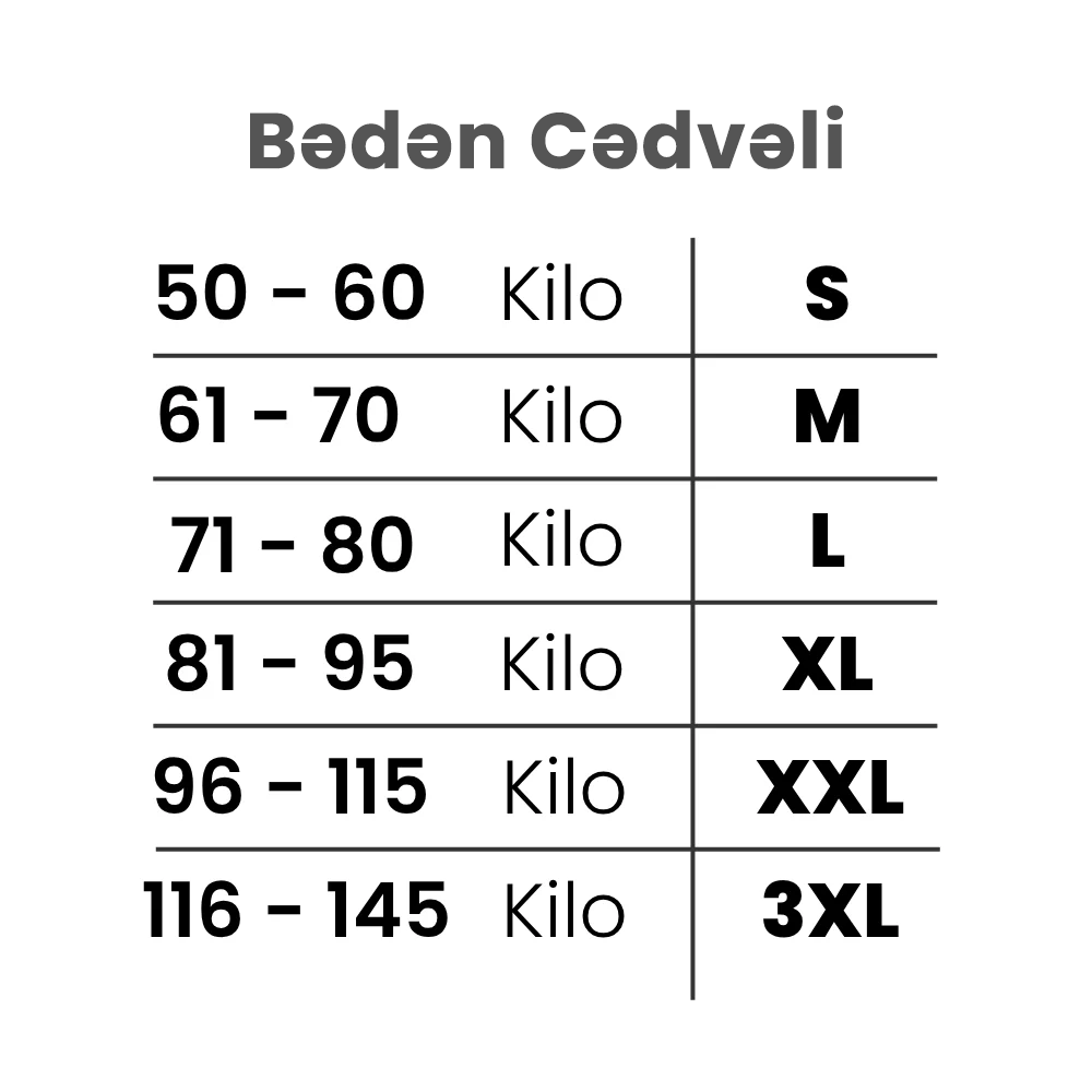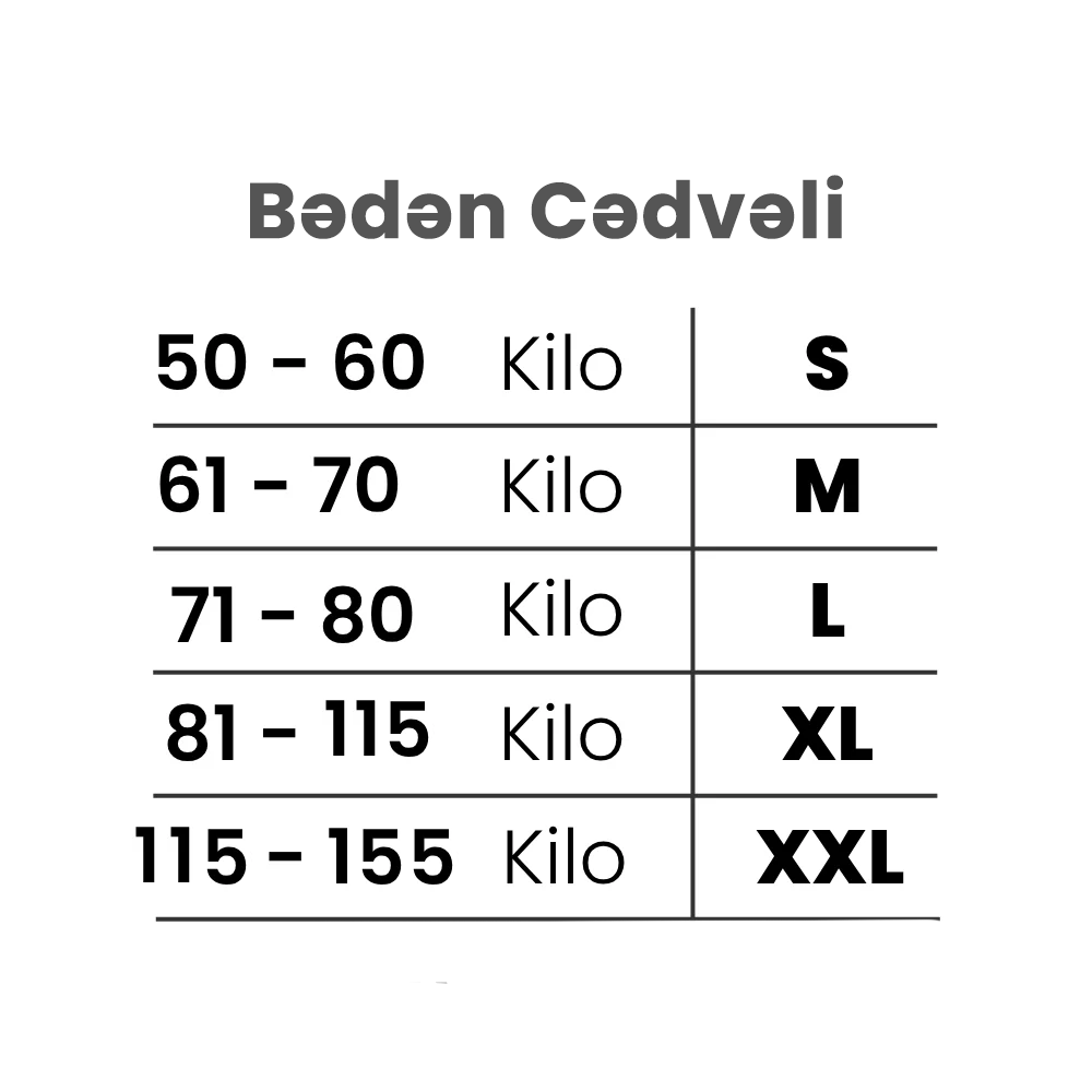 Çəki və boyunuza uyğun olaraq ölçü cədvəlimizdən düzgün ölçünü seçə bilərsiniz. Əgər tərəddüd edirsinizsə, dəstək komandamız sizə kömək edəcək.